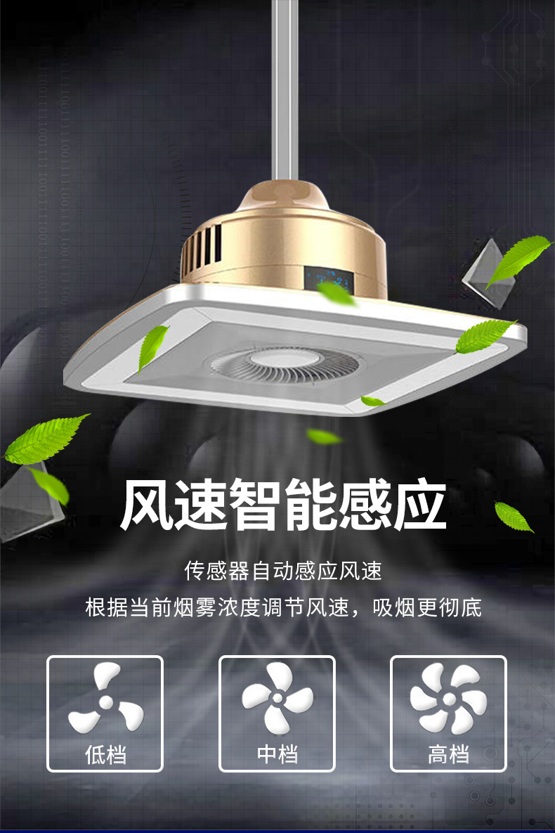 傳感器自動(dòng)感應(yīng)風(fēng)速,根據(jù)當(dāng)前煙霧濃度調(diào)節(jié)風(fēng)速,三擋調(diào)節(jié)。多重凈化技術(shù)。