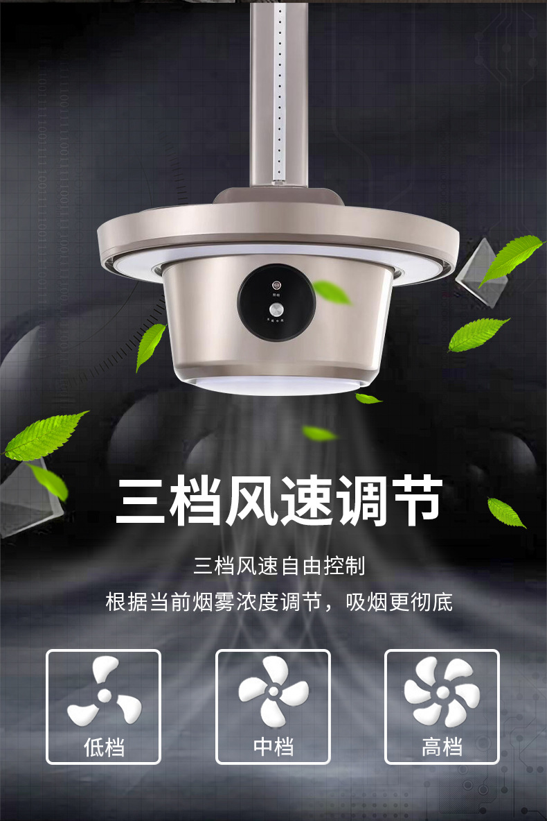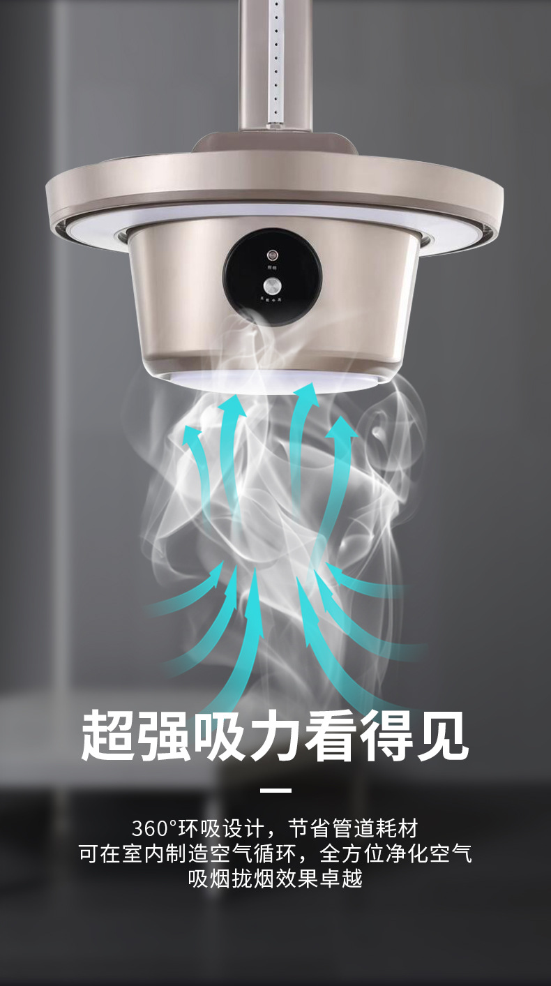 吸力大,聲音小,重量輕。360°環(huán)吸設(shè)計,節(jié)省管道耗材。可在室內(nèi)制造空氣循環(huán),全方位凈化空氣吸煙攏煙效果卓越。